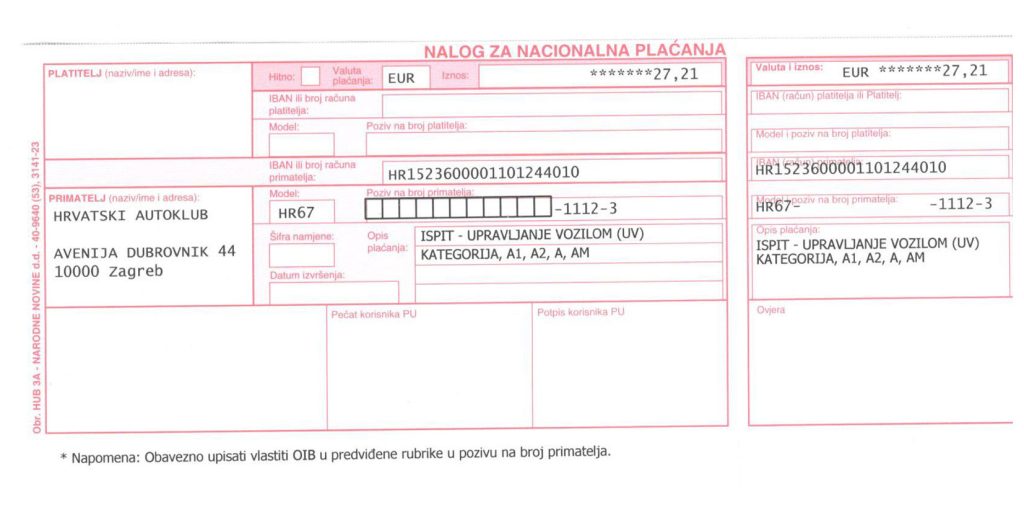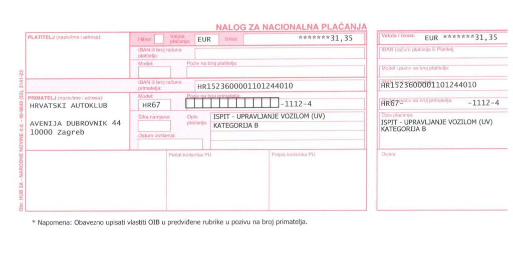 Podaci za uplatnicu ispita za polaganje B kategorije