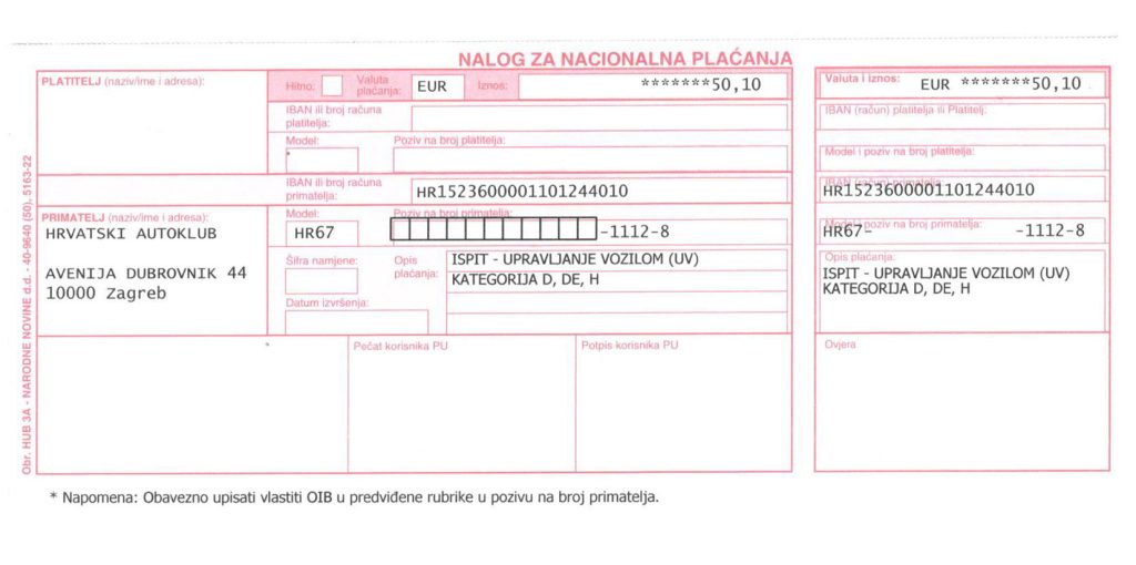 Podaci za uplatnicu ispita za polaganje BE, C1, D1, B kod 96 kategorije
